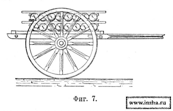 Для перевозки мелких снарядов, зарядов и других некрупных предметов на раму ставился и закрепляется засовами ящик m, состоящий из 4 стенок, а для укладки снарядов более 6-дм. калибра, вместо ящика, клались особые прокладочные клетки — рамы (фиг. 7), между которыми и клались снаряды лежмя.