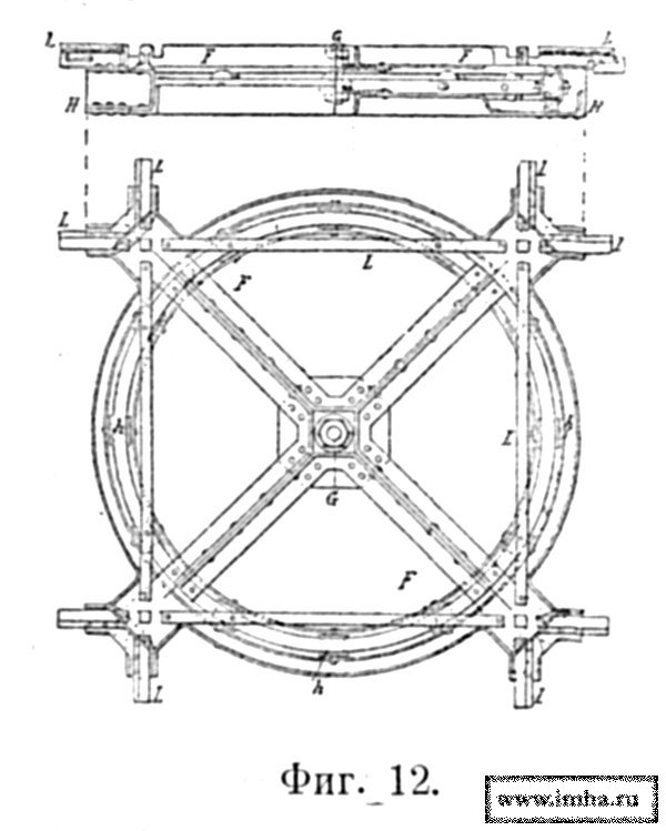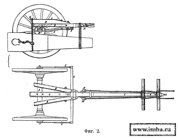 Передок состоял из железной оси А (фиг. 1) с двумя колесами диам. 68 дм. и шириною шины 4 дм., при ширине хода — 57 дм., и из прикрепленной подвязями деревянной рамы, состоящей из 3 продольных брусьев С и В, при чем средний В вдвое шире боковых и был снабжен спереди вырезом для выставки дышла Е, прикрепленного двумя сквозными болтами d. На заднем конце среднего бруса укреплен шворень F для надевания хобота лафета при перевозке. Впереди шворня привинчен железный дуговой слизень G, на который и ложился хобот. В середине была прикреплена поперечная железная доска H с вырезами для помещения двух железных тормозных башмаков К, когда в них нет надобности. Спереди поперек брусьев приделана постоянная вага N с 2 вальками Т для постромок и к ней привязана другая накладная вага Р с другой, парой вальков.