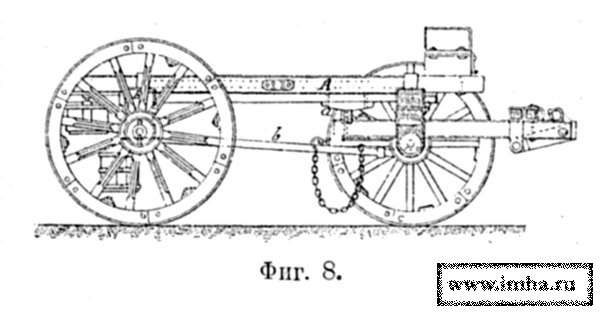 Состоял из железной оси (фиг. 3) с 3 колесами диам. 54 дм. и шириною шины 24 дм. и из шарнирно с нею связанных дышла и 4 железных тяг, идущих к дышлу и к концам железной же ваги, укрепленной на дышле.