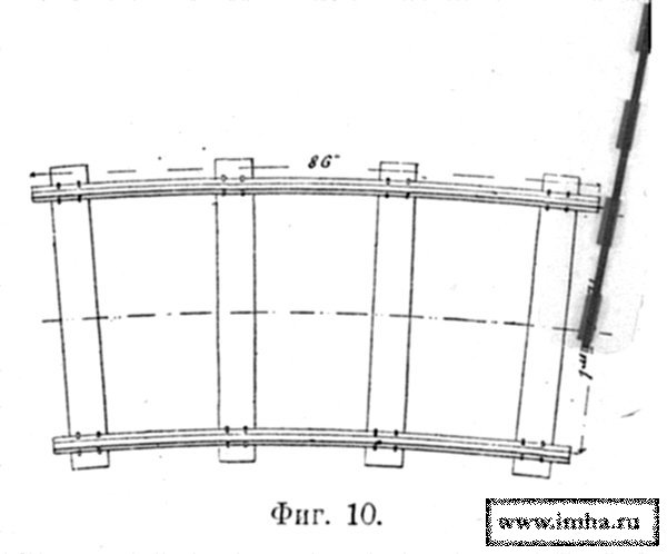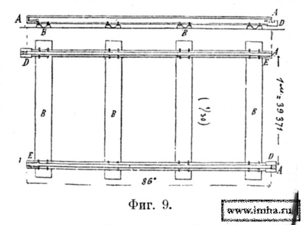 В накладку заднего хода врезывались продольные брусья рамы А (фиг. 8), а на передний ход рама была наложена своим поперечным брусом на шворне.