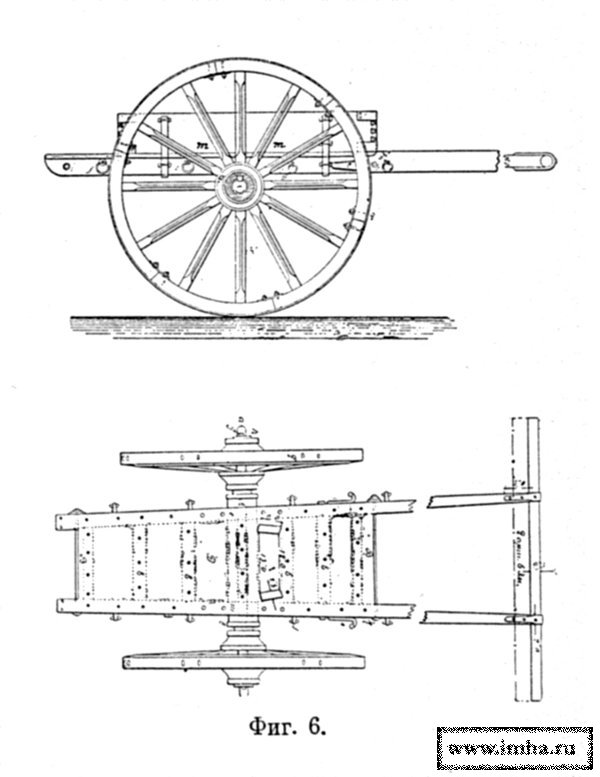 Тележка (фиг. 6) состояла из железной оси, врезанной в деревянную накладку, с которой скреплена подвязями рама, состоящая из 2 продолmys[ брусьев, переходящих в оглобли с поперечjq ручкой, и из 2 поперечных брусьев — переднего и заднего; продольные брусья связывались 2 железными болтами i, k и расперты 4 поперечными брусками Е. Поверх рамы имелся досчатый настил Д.