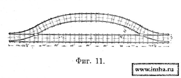 Наибольшее распространение имела система генерал-лейтенанта Тахтарева; она предназначалась для перевозки грузов до 560 пд, имела ширину колеи 1 м и состояла из прямых (фиг. 9) и кривых (фиг. 10) рельсов, звеньев дл. 86 и 40 дм., стрелок, разъездов (фиг. 11), поворотных кругов (фиг. 12), вагончиков (фиг. 13) и платформ.