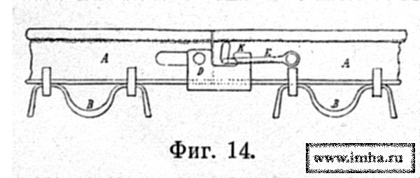 Соединение стыков производилось помощью скоб Е на одном из концов рельса и подвижных башмаков Д с крюками К на другом конце.