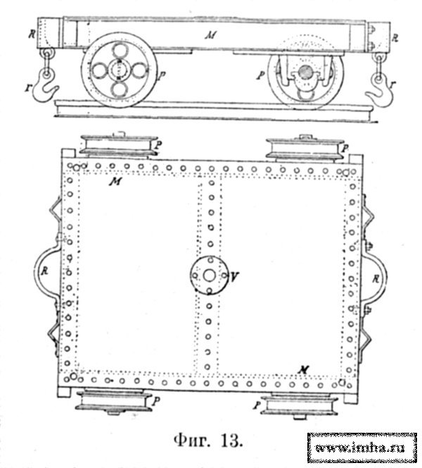 7) Медведка служила для перевозки грузов до 1000 пд. и состояла (фиг. 5) из 2 ходов, соединенных прочной брусчатой деревянной рамой, окованной железом. Оба хода — одинакового устройства, состояли, каждый из железной оси с 2 чугунными катками и со шворнем посреди лопасти, на который надевался поперечный брус рамы; ось от вращения около своего шворня могла удерживаться 2 засовами.