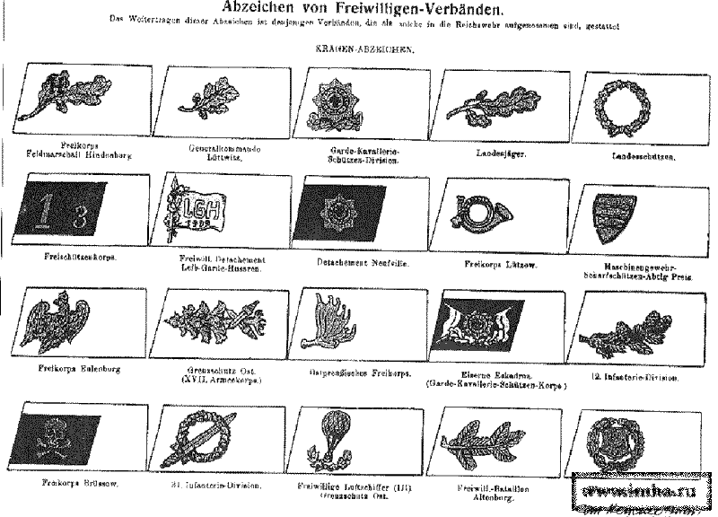 /19/ См.: Die Freiwilligen-Verbaende und ihre charakteristischen Abzeichen in Originalzeichnungen nach Carl Henkl // Die neue deutsche Reichswehr, Zweiter Teil, Leipyig 1919.