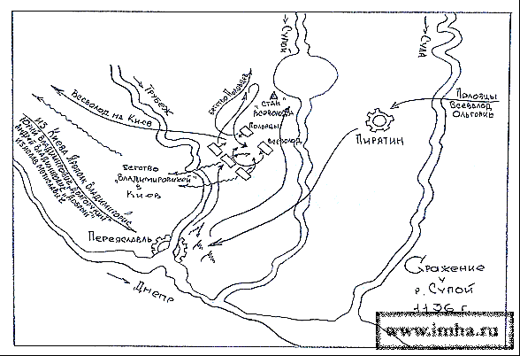В отечественной военной историографии никогда не привлекалось для изучения сражение 1136 г. у реки Супой под Переяславлем между объединенными войсками Всеволода Ольговича Черниговского и Ярополка Владимировича Киевского. Возможно, по тому, что сражение происходило по сложившимся традициям – атака противника по фронту "и бывшю съступлению обеима полкома . и бишася крепко».[7]