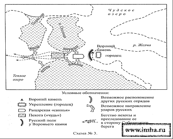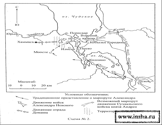 [39] "Разведка Александра наблюдала за сборами немецких войск… Александр Ярославич стремился дезорганизовать противника и "распусти все воиньство свое в загоны» (Никоновская летопись), но рыцарские войска оказались слишком сильными. Тактика рейдов не оправдала себя, но помогла выяснить расположение сил противника. Алескнадр начал концентрировать свои силы и отсутпил на лед Чудского озера» (Очерки русской культуры XIII – XV вв. Ч.1. М., 1969. С. 360).