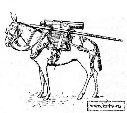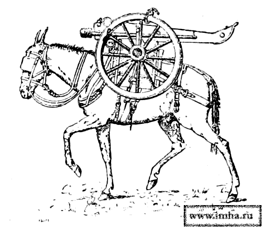 Для вьючения необходимо 4 мула: по два — на орудие и на лафет с колесами и передком.
