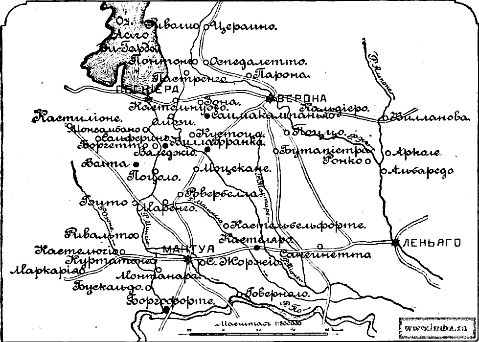 | ИТАЛЬЯНСКИЙ (ВЕНЕЦИАНСКИЙ) ЧЕТЫРЕХУГОЛЬНИК крепостей образуют крепости: Верона и Леньяго на р. Эч и Мантуя и Пескьера на р. Минчио. |