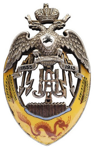 На верхнюю часть подковы наложен серебряный оксидированный двуглавый орел, увенчанный серебряной оксидированной Императорской короной с ниспадающими из-под нее серебряными лентами. На груди орла серебряный щиток, покрытый эмалью белого цвета, со Св. Георгием Победоносцем, поражающим змея, выполненными эмалью черного цвета. Из-под крыльев орла ниспадают четыре золотых молнии. В лапах орел держит серебряную ленту с датами «1655" и «1913", выполненными эмалью черного цвета. Между орлом и частоколом находится серебряный совмещенный вензель Императоров Александра II и Николая II.