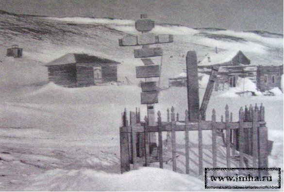 Могила Василия и Марии-Татьяны Прончищевых в поселке Усть-Оленек. На прибитых досках текст, сверху вниз: "Памяти славного Прончищева и его жены Марии... Ленск. гидрограф. эксп. 1921 г." |