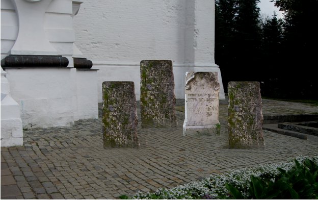 Реконструкция ситуации: во 2–м ряду три памятника. 1 - й, Д. М. Скуратова. 2 - й, (светлый) или средний - Прокофия Петровича Ляпунова. 3 - й, за П. П Ляпуновым - Ивана Ржевского. Расположение мест захоронения в точности соответствует таким же, как на левой части паперти. В настоящий момент никаких памятных знаков на могилах нет, одна брусчатка, по которой ходят все кто посещает лавру. Топчут не только место захоронения, затаптывают историю России.