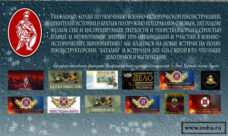 УВАЖАЕМЫХ КОЛЛЕГ ПО УВЛЕЧЕНИЮ ВОЕННО-ИСТОРИЧЕСКОЙ РЕКОНСТРУКЦИЕЙ, И ЦЕНИТЕЛЕЙ ИСТОРИИ И БРАТЬЕВ ПО ОРУЖИЮ ПОЗДРАВЛЯЕМ С НОВЫМ, 2013 ГОДОМ!