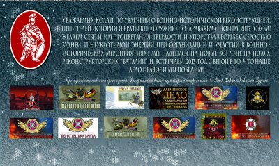 ЖЕЛАЕМ СЕБЕ И ИМ ПРОЦВЕТАНИЯ, ТВЕРДОСТИ И УПОРСТВА В БОРЬБЕ С СЕРОСТЬЮ БУДНЕЙ И НЕУКРОТИМОЙ ЭНЕРГИИ ПРИ ОРГАНИЗАЦИИ И УЧАСТИИ В ВОЕННО-ИСТОРИЧЕСКИХ МЕРОПРИЯТИЯХ! МЫ НАДЕЕМСЯ НА НОВЫЕ ВСТРЕЧИ НА ПОЛЯХ РЕКОНСТРУКТОРСКИХ “БАТАЛИЙ" И ВСТРЕЧАЕМ 2013 ГОД С ВЕРОЙ В ТО, ЧТО НАШЕ ДЕЛО ПРАВОЕ, И МЫ ПОБЕДИМ!