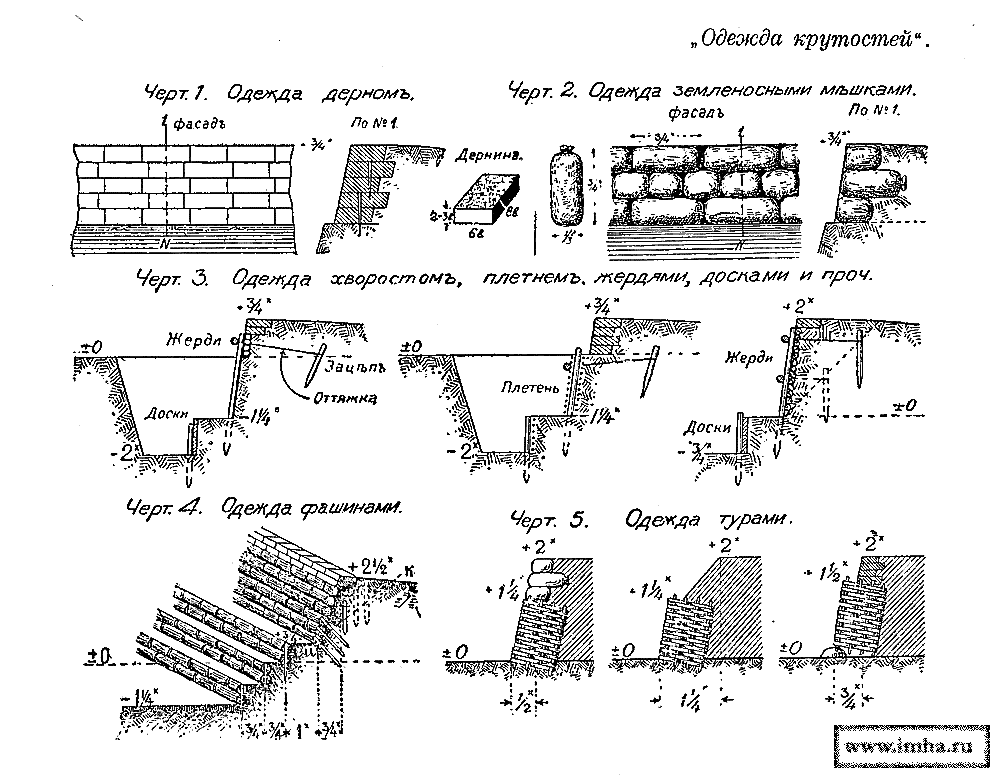 Одежда устраиваются из дерна, дерновых или земляных комьев, из земленосных мешков и из лесных материалов, как-то: туров, фашин, плетней, хвороста, жердей, досок и проч. (см. .).