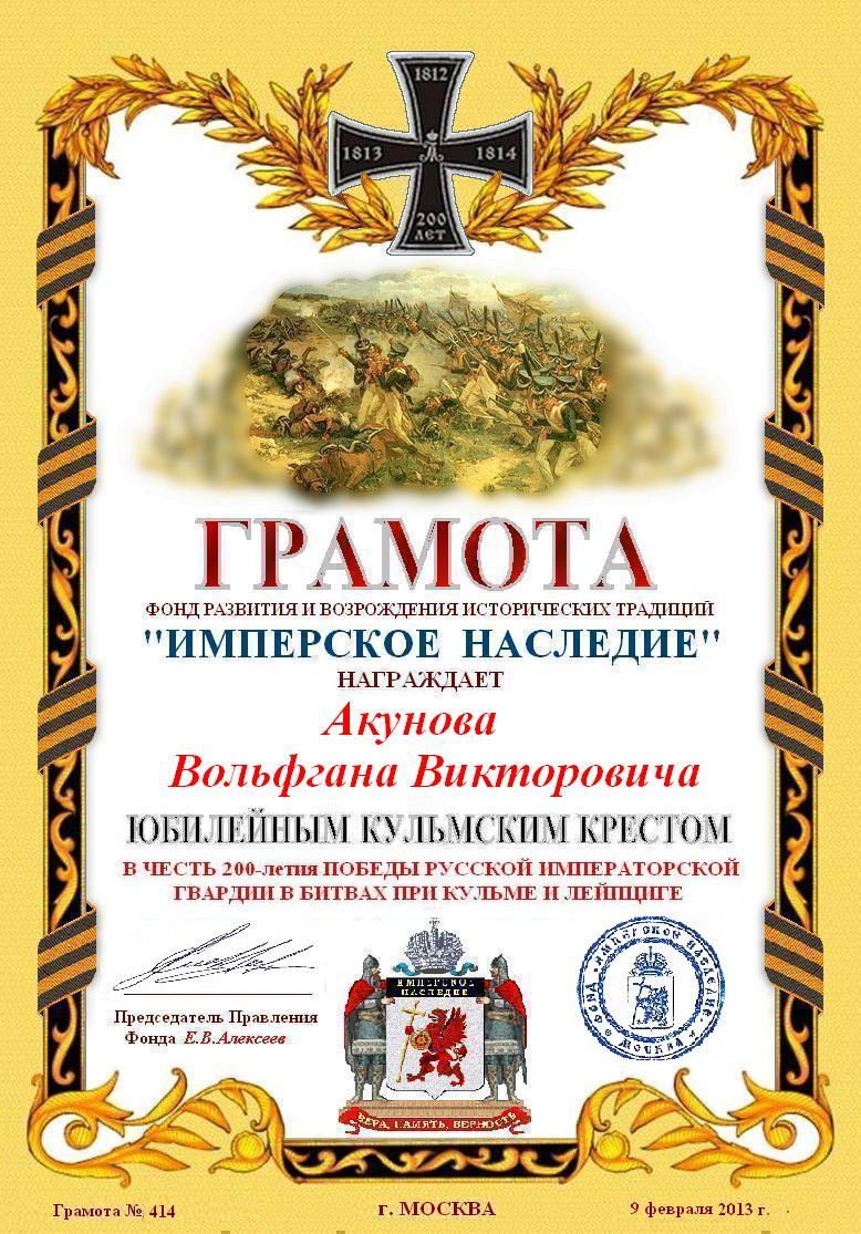 В первой половине XIX века Кульмский крест пользовался в России огромной популярностью и почетом, хотя именовали эту награду в нашей стране по pазному, одни – "Прусским Железным Крестом", другие – "Знаком Отличия Железного Креста" (по аналогии со Знаком Отличия Военного Ордена Святого Георгия). Знаки, изготовленные в Берлине, попали в столицу Российской Империи только в мае 1815 года. 26 апреля (старого стиля) 1816 года "Русский Инвалид" писал: "... 24 числа сего месяца получены здесь отличия "Железного креста". Его Величество Король Пруссии Высочайше соизволил определить оные для раздачи тем из Гвардейских частей, которые с отличным мужеством сражались при Кульме в 17 день августа 1813 года. По случаю вручения сих лестных наград командующий Гвардейским корпусом Господин генерал-от-инфантерии Милорадович отдал следующий приказ: "Государь Император и Союзные монархи вместе с целой Европою отдали полную справедливость непреодолимому мужеству, оказанному войсками Российской Гвардии в знаменитом бою при Кульме в 17 день августа 1813 года. Но Его Величество Король Прусский, желая особенно ознаменовать уважение Свое к отличному подвигу сих войск, соизволил наградить их Знаком Отличия Железного Креста..." (курсив наш – В.А.).