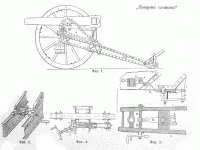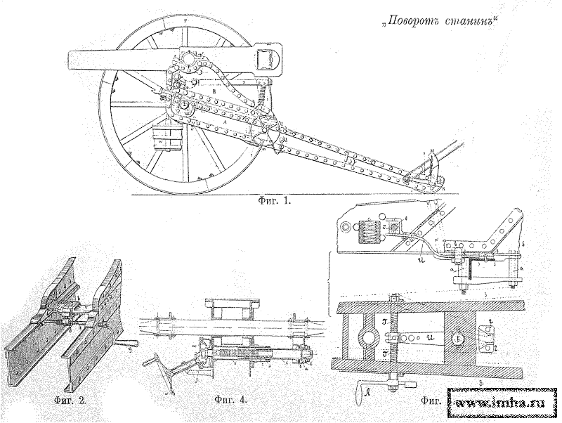 К задней же связи V нижнего лафета (фиг. 2) прикреплена матка d, сквозь которую проходит винт A поворотного механизма, помещенного поперек станин нижнего лафета и снабженного рукоятью у.