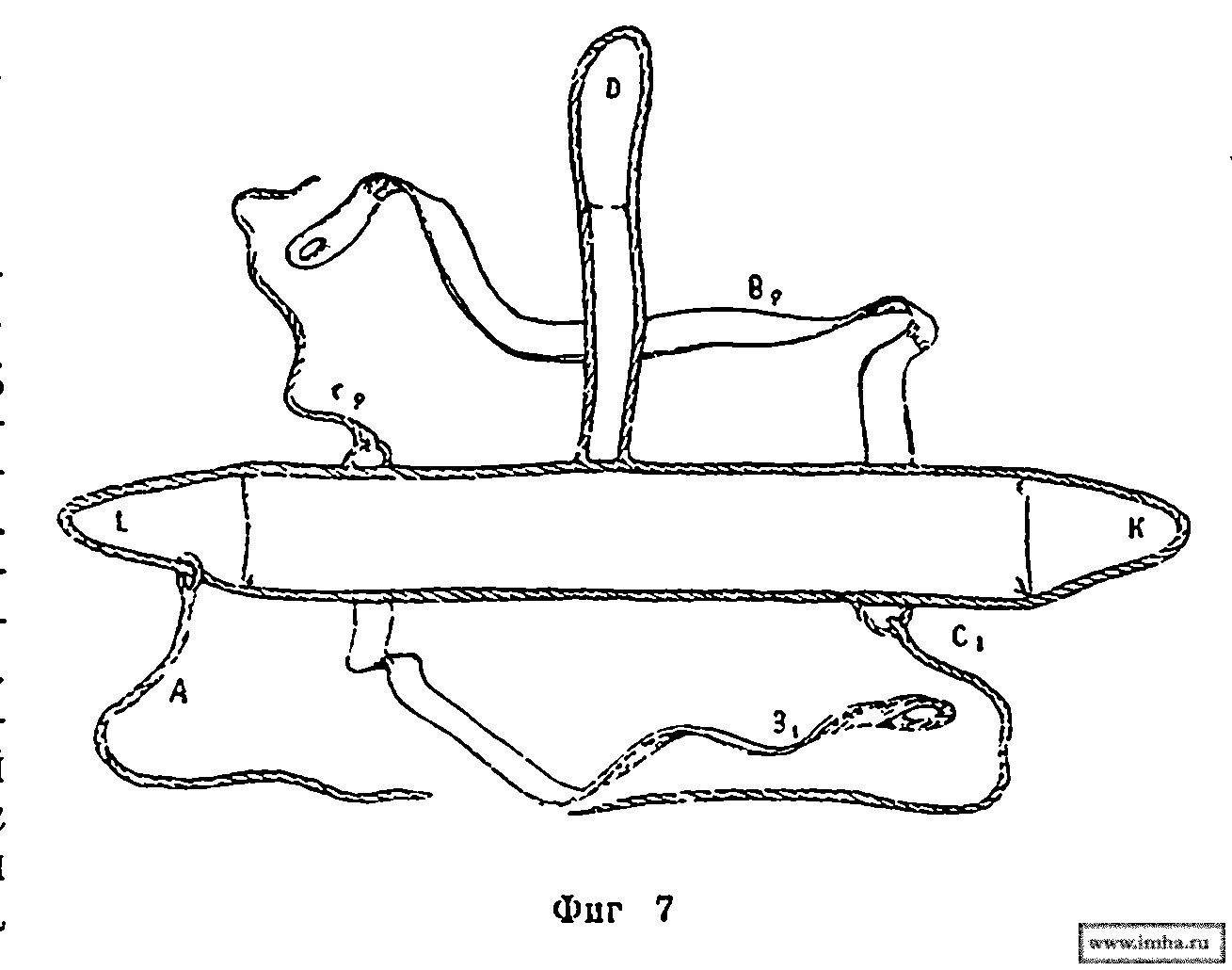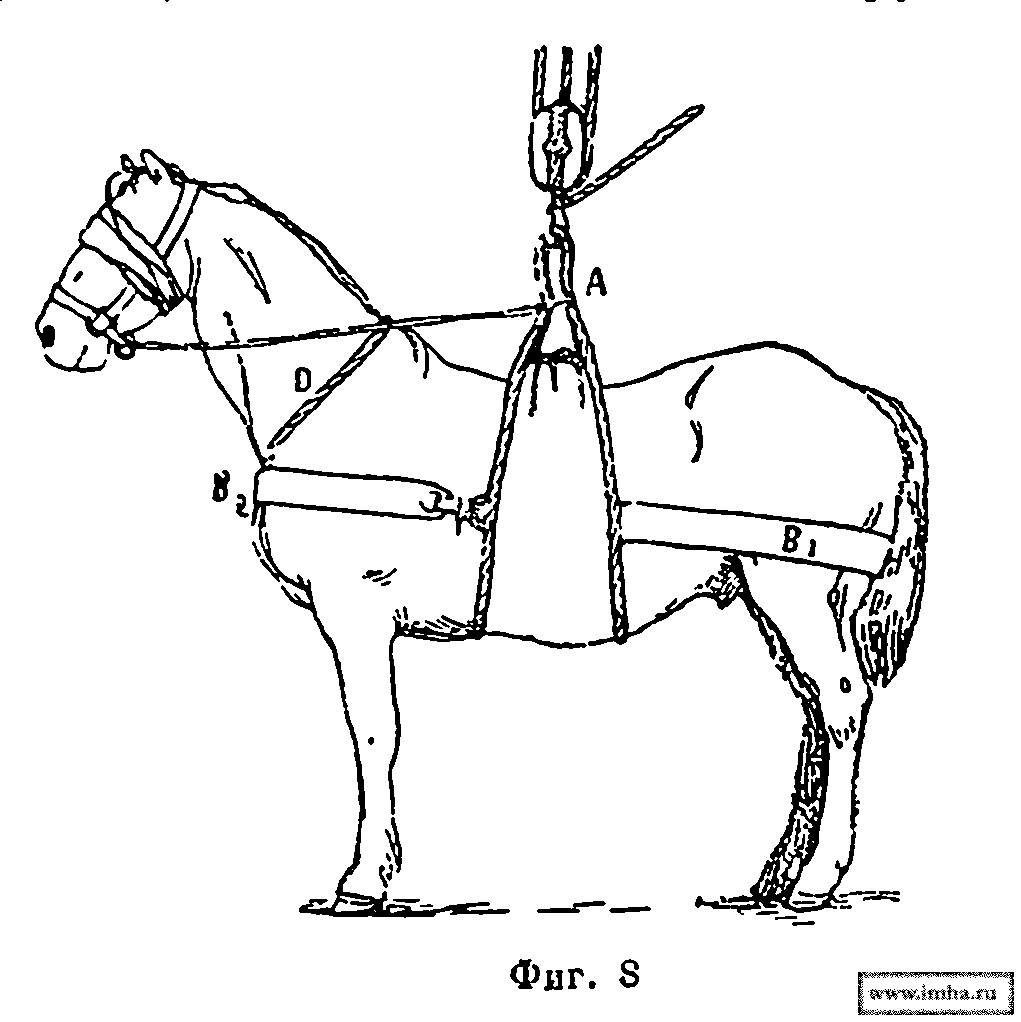 Для подъема в море лошадей и скота делаются особые стропы из парусины (в 2 слоя), обшиваемой 3-дм. тросом (фиг. 7—8). Лошади завязывают глаза; но лучше специальный ящик из дерева, обитый железными полосами и выложенный внутри войлоком.