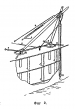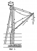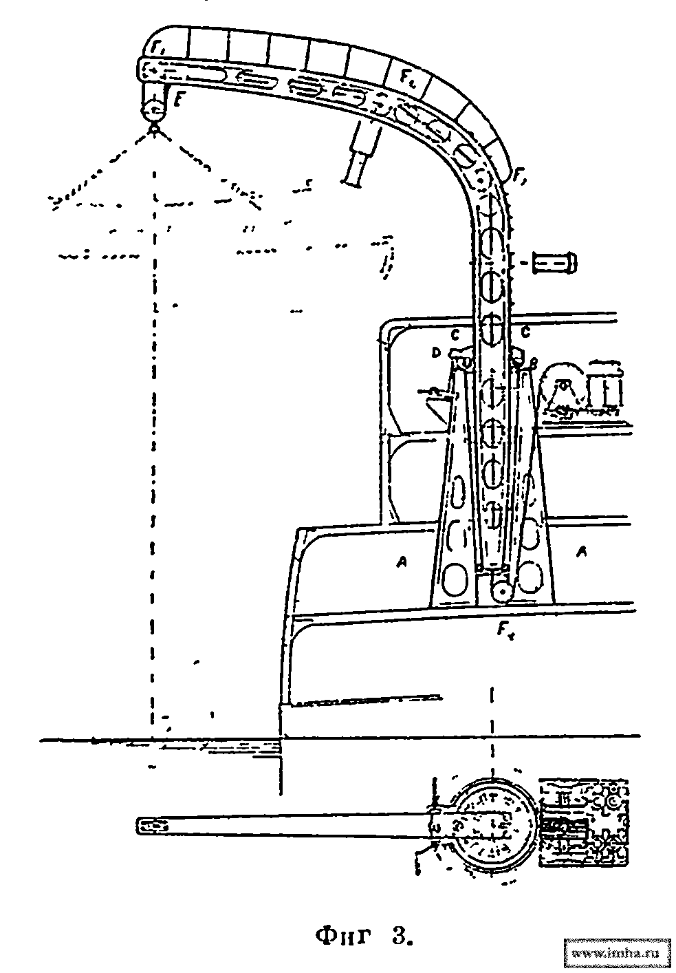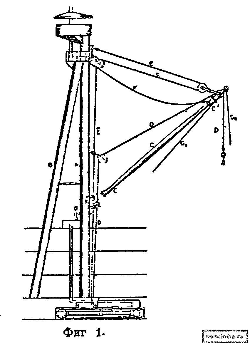 На фиг. 1 показана стрела, устанавливаемая на судах: подъемный гордень D и ходовой топенант E выбираются гидравлическим насосом, помещенным у самого шпора стрелы Н, постоянный топенант F служит для обычного уклона стрелы, башмак К укреплен на некоторой высоте от палубы или борта, сама стрела — стальная, полая, со шкивом для горденя и обухами для завалталей или бакштагов на ноке. Фиг. 2 изображает временную стрелу, устраиваемую судовыми средствами и состоящую из 2 крепких брусьев, ноки которых связываются накрест бензелем или найтовом, a шпоры устанавливаются в укрепляемых на борту башмаках.