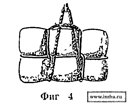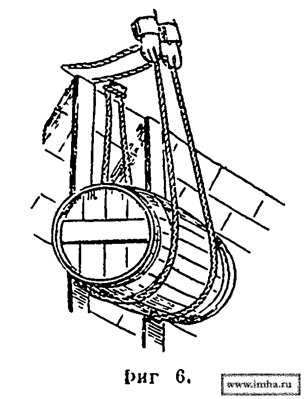 Строп верхнего блока подъемных талей кладется поверх связывающего бревна найтова, покрывается клетнем и парусиной.