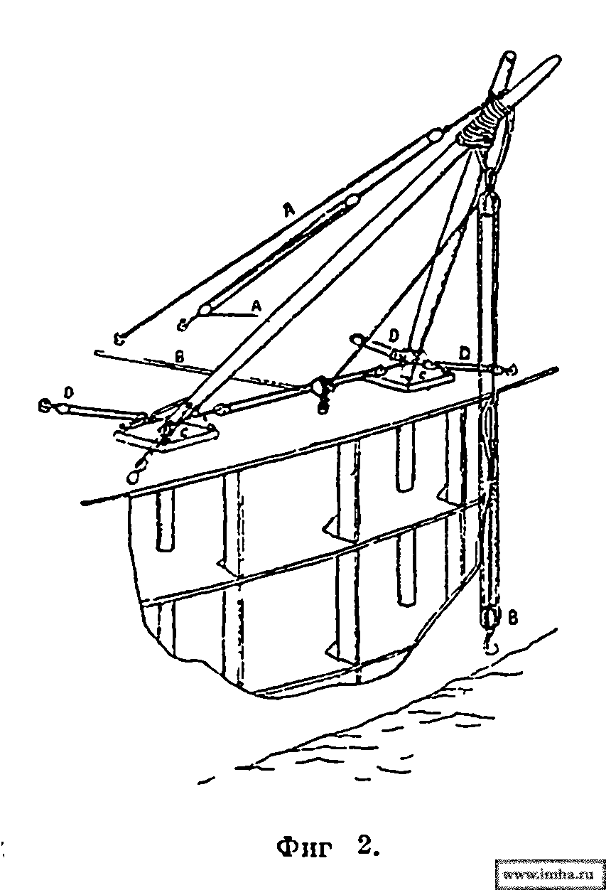 Для первоначального подъема временных стрел на гладкой палубе употребляют небольшие добавочные стрелы, с помощью которых ноки стрел поднимаются настолько, чтобы начали действовать верхние бакштаги. Натяжение последних тем больше, чем гориз-нее установлены стрелы и меньше угол между ними и топенантом. Иногда для подъема тяжестей между мачтами заводится особый шкентель т. наз. штаг-карнак, за который берутся подъемные тали.