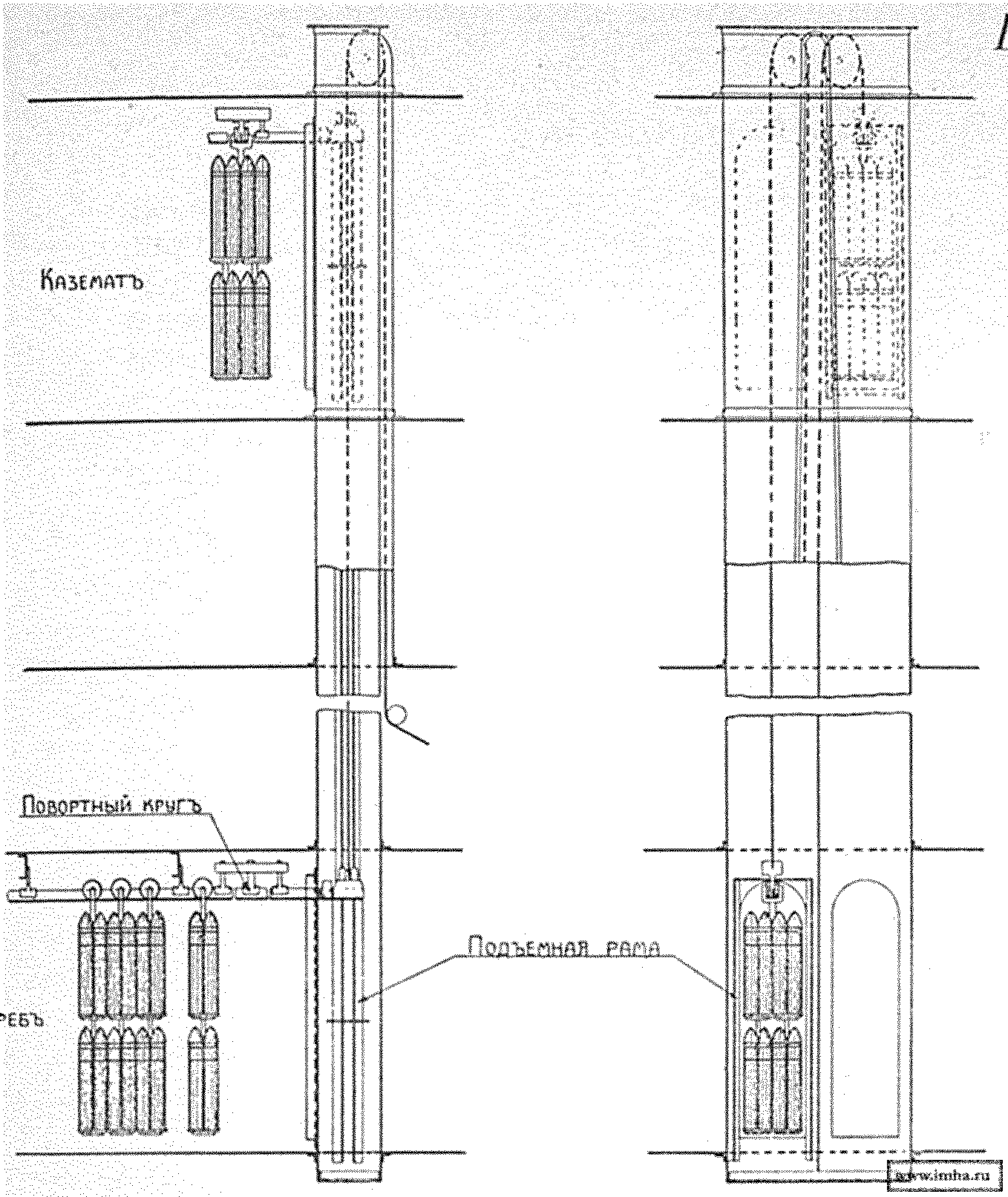 Погреб помещается около нижней части башни, т. ч. зарядник в нижнем своем положении приходится в погребе; там в него вкладывают заряд и снаряд, поднимают к пушке и непосредственно вталкивают в нее, а затем опускают зарядник вниз и приготовляются к следующему заряжанию.