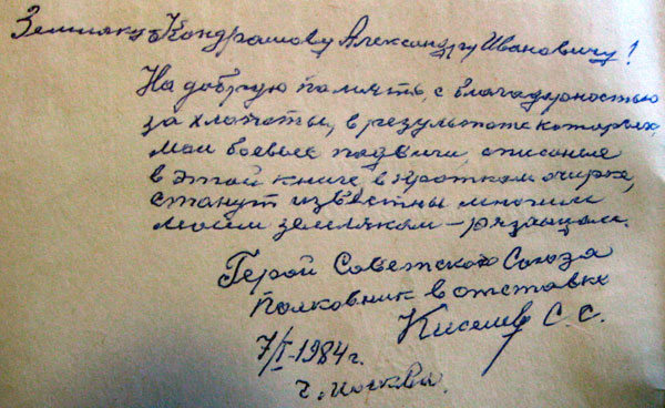 "тов. Кирюшкин находясь на фронте в составе 93 с. п. 76 стрелковой Ельнинской дивизии 21 Армии Западного фронта, получил тяжелое ранение 30 августа 1943 года в ходе наступательных боев за овладением городом Ельня Смоленской области. В настоящее время в виду ранения уволен из Красной Армии и проживает в нашем районе, к работе относится честно, добросовестно, пользуется авторитетом в нашем районе.
