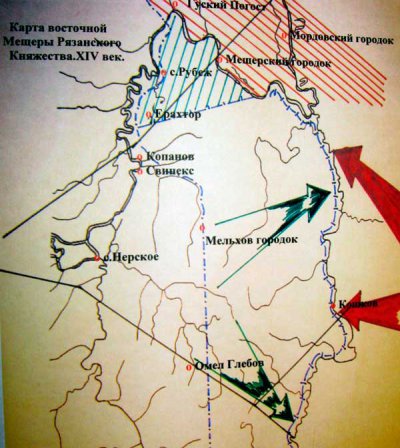 Ситуация развивалась следующим образом. К 1360 г. старая Рязанская граница на востоке проходила от Омел Глебов на Пластиков и Мелехов городок, который стоял в центре, между Мещерой и Подлеским станом, и дальше шла по речке Середней(ныне р. Середник) до Оки и вверх по ней. На севере Мещера лежала по левобережью р. Оки, на востоке, сразу за речкой Парой.