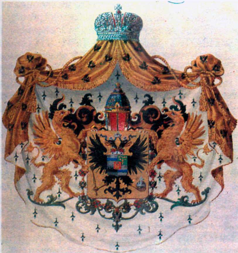 Большой герб князей Романовских Герцогов Лейхтенбергских [3].Шит золотой, и в нем помещен государственный орел, на груди которого шит четверочастный: в первой и четвертой частях лазоревое поле, во второй части меч, окруженный звездами о шести лучах, в третьей части черный пояс, а на нем три птицы. В малом щитке вензель Императора Николая I. Над главным шитом шлем Св. князя Александра Невского. Щитодержатели два грифа. Золотая мантия увенчана императорской короною. Герб Герцогов Лейхтенбергских внесен в "Общий Гербовник», часть XV, под № 1 [4]. |