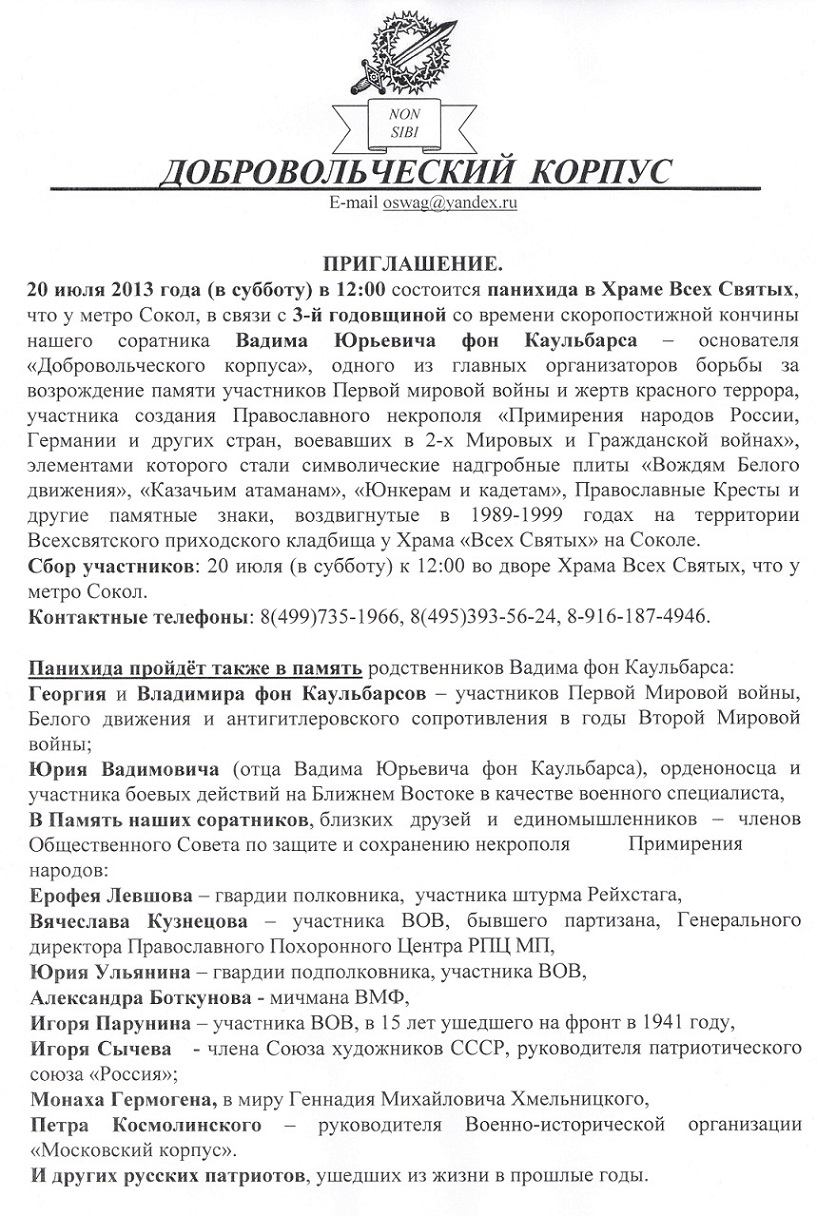 20 июля 2013 года (в субботу) в 12:00 состоится панихида в Храме Всех Святых, что у метро Сокол, в связи с 3-й годовщиной со времени скоропостижной кончины нашего соратника Вадима Юрьевича фон Каульбарса – основателя "Добровольческого корпуса», одного из главных организаторов борьбы за возрождение памяти участников Первой мировой войны и жертв красного террора, участника создания Православного некрополя "Примирения народов России, Германии и других стран, воевавших в 2-х Мировых и Гражданской войнах», элементами которого стали символические надгробные плиты "Вождям Белого движения», "Казачьим атаманам», "Юнкерам и кадетам», Православные Кресты и другие памятные знаки, воздвигнутые в 1989-1999 годах на территории Всехсвятского приходского кладбища у Храма "Всех Святых» на Соколе.