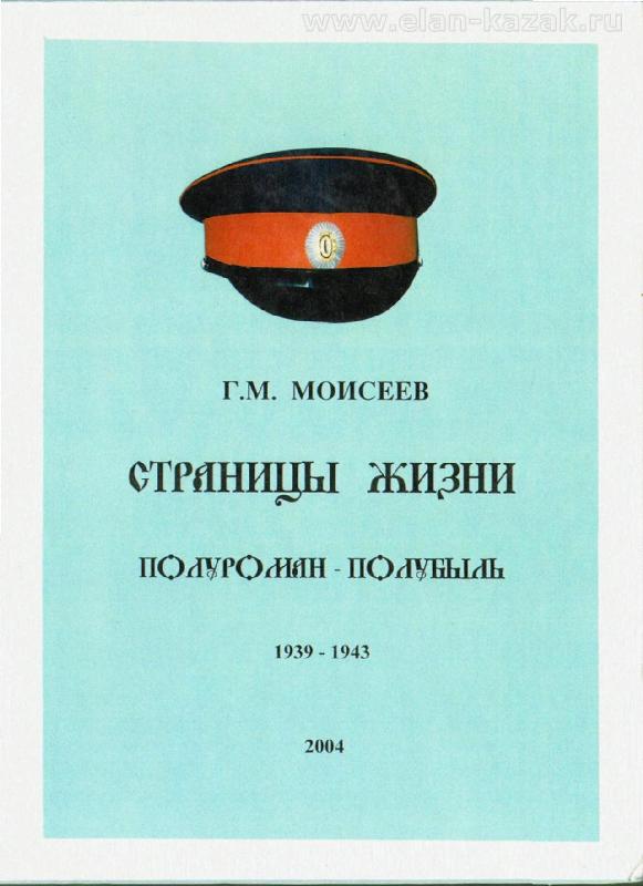 …Нас познакомил на рубеже веков главный редактор и издатель журнала "Отечество и Вера", М. Д. Смыслов. И с тех пор завсегдашний "военно-политический обзор", непременно в белом узком конверте, с обратным адресом: George M. Moiseyev, Lanark, Ontario CANADA, константно приходил мне. Как сейчас помню полученное большое почтовое отправление с его книгой: "Страницы жизни. Полуроман-полубыль. 1939-1943», Онтарио, 2004 г. Одно из изданий Георгия Митрофановича. Первая часть начинается с событий 1939 года; вторая описывает отступление казачьих формирований осенью 1945 года, беженские годы в Праге и Мюнхене; третья – эмиграция семьи Моисеевых в Австралию и жизнь его до переезда в Канаду… А на обложке, в первой книге, фотографическое изображение донской фуражки, которую я ему присылал в своё время за океан, сшитую у замечательного мастера Михаила Зацепина по старинным лекалам.