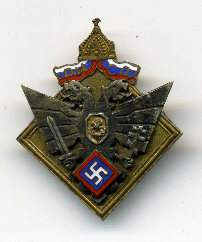 Значок Движения. Значок РНСД, предназначенный для ношения всеми соратниками, представляет собой ромб, сочетающий русские национальные цвета (белый, синий и красный - В.А.) со знаком свастики. Это сочетание знаменует собой сочетание национального и социального начал в мировоззрении РНСД и общность российской в обще-арийской борьбы за освобождение от иудейского гнета./3/