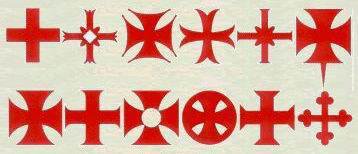 Другим уникальным символом рыцарей-тамплиеров является красный крест, который они носят на своих белых плащах. Вначале сам по себе красный крест не представлял отдельный от плаща символ ордена Храма. Марион Мельвиль описывает в своей "Истории...» (стр.60) появление красного креста на белых плащах тамплиеров в следующих выражениях: "В следующем году (1147 г.) папа Евгений III прибывает в Париж. Перед алтарем в аббатстве Сен-Дени, король принимает посох паломника и получает из рук папы орифламму (главное военное знамя королевства, представлявшее собой в описываемый период алое полотнище, расшитое золотыми "пламенами», то есть языками пламени - В.А.). В Пасхальную октаву (27 апреля) Евгений III присутствует на Генеральном соборе ордена Храма в их новой резиденции в Париже, где присутствовал также король Франции, архиепископ Реймса и многие другие прелаты. Собралось сто тридцать рыцарей, каждый из которых надел свой белый плащ. Магистр Франции Эврар де Бар напоминает своим самым лучшим воинам, идущим в горы Киликии на помощь французским рыцарям об их опыте войны в Испании против мавров». Очевидно особое впечатление, которое производят тамплиеры, поскольку фраза "братия ордена Храма < >, каждый из которых надел свой белый плащ», повторяется многими историками, даже в официальных документах. На этом соборе папа Евгений III дарит тамплиерам право носить изображение алого креста на левой стороне своего плаща, "чтобы этот победоносный знак служил им как щит, и никогда не отступать перед неверными». Крест вырезался из красной ткани (обычно из сукна) и был самой простой формы: "принадлежащие к ордену Храма носят обыкновенный крест красного цвета». Марион Мельвиль умалчивает о том, когда именно стали использовать крест "патэ» (лапчатый крест - первый из второго ряда тамплиерских крестов различной формы, помещенных нами в заголовке настоящей военно-исторической миниатюры) или "тагму» (четвертый из второго ряда), как основные символы Ордена Храма, но касательно четвертого из первого ряда, один болгарский исследователь имеет свое особое, весьма интересное мнение. В этом нет ничего странного, поскольку Болгария всегда была частью связывающего звена Востока, с его древними верованиями, с христианской Европой.