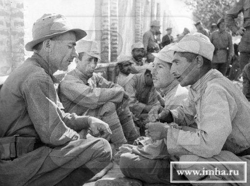 | Командарм А.А. Хадеев | Командующий ЗакФ Д.Т.Козлов | Красноармеец беседует с иранскими солдатами | Наш истребитель И-16 |
