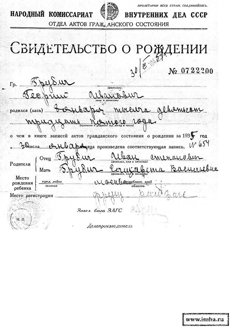 Свидетельство о Рождении Георгия Ивановича Грубича |