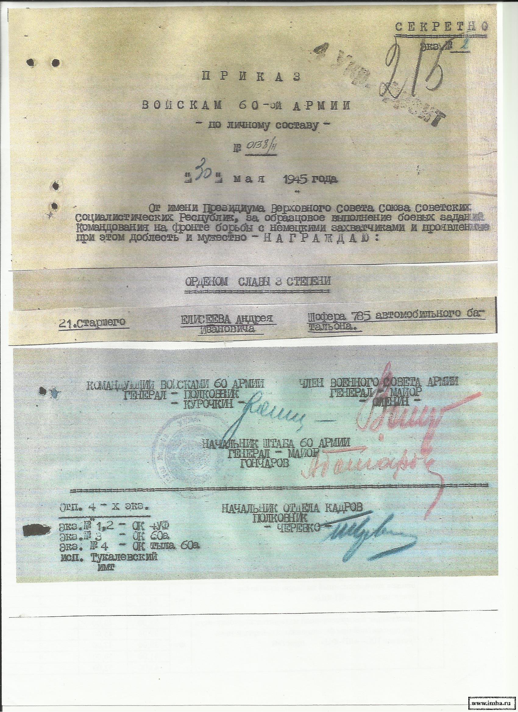 Неумные историки и всякого рода исследователи винят в этот командующего фронтом Г.К. Жукова, не подозревая, что в этом и есть суровая логика войны, немцы усилили опасные направления нашего удара за счет снятия сил с других участков советско-германского фронта. А войска соседнего 4 Украинского фронта, воспользовавшись создавшимся положением и продвинулись так далеко! В этом была и минимальная заслуга отца и командование 785 ОАБ 17 мая 1945 года представила его к солдатскому ордену "Слава 3 степени», а приказом командующего по войскам 60 армии от 30 мая 1945 года от имении президиума Верховного Совета СССР старший сержант, шофер 785 отдельного автотранспортного батальона, Елисеев Андрей Иванович был представлен к награждению правительственной наградой – ордену "Слава 3 степени»! Через неделю, самое большее другую, отец мой этот орден получил бы, но как говорится, вмешался случай в конце апреля 1945 года его отозвали в часть, где он прежде служил и сего началось моё повествование. Поэтому отцу, сыну кулака и незаконно репрессированному, Победу пришлось встречать без ордена "Славы», который, как известно, является историческим продолжением георгиевского креста, особо почитаемого у нас, у казаков. 25 декабря 1945 года, после демобилизации, мой отец возвратился в свой родной хутор Гришинский, бывшей Области Войска Донского, на груди его выцветшей гимнастерки скромно поблескивала единственная награда - медаль "За оборону Сталинграда», но отец был рад, что наконец кончилась война и он в кругу своих родных и знакомых, что начинается мирная жизнь!