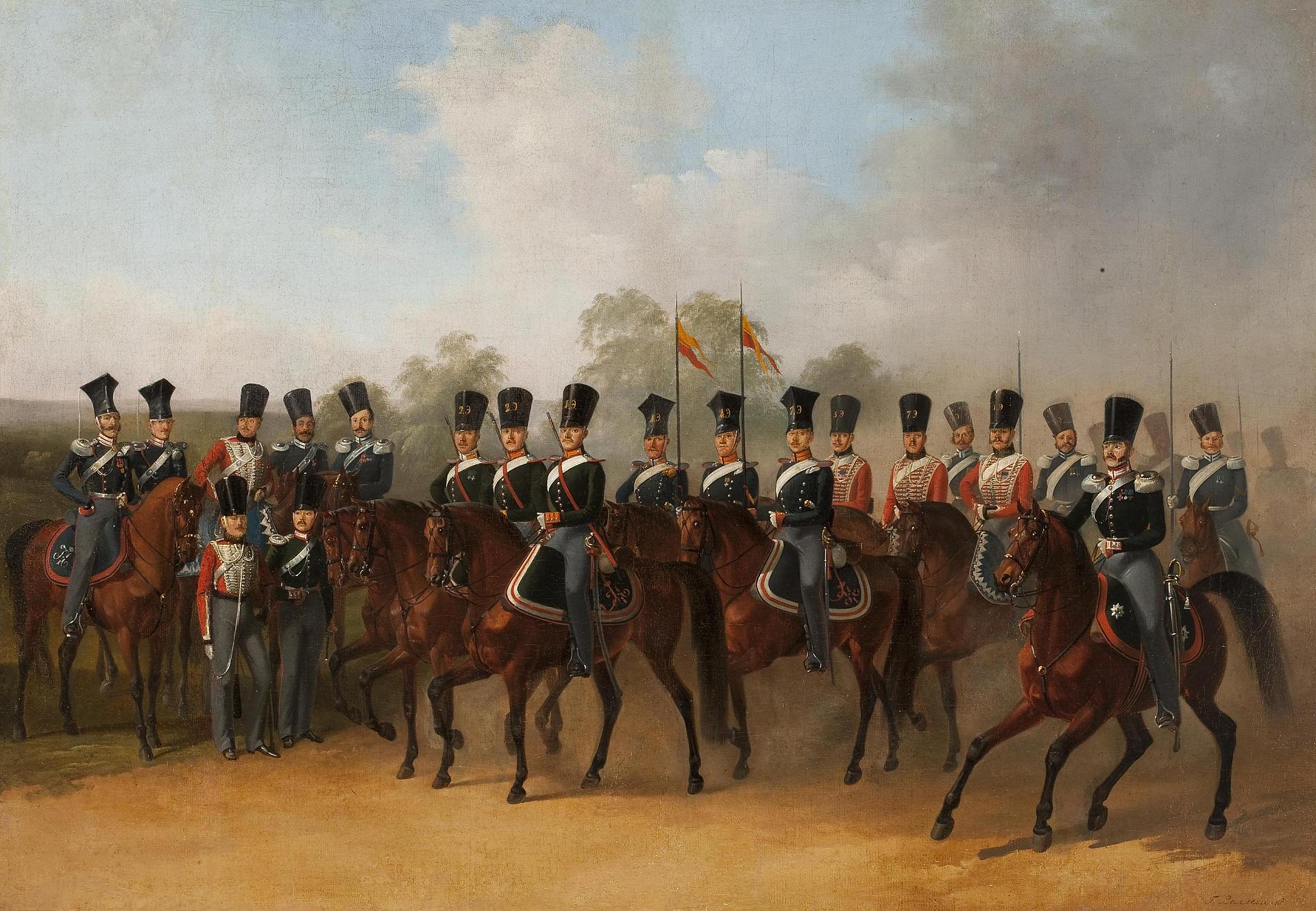 | Группа офицеров и юнкеров Николаевского кавалерийского училища. Виллевальде Б.П. 1818-1903. Россия, 1847 г., холст, масло, 67,5х96 см., ГЭ |