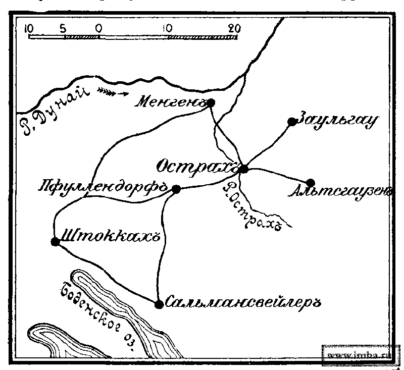 Во время наступательного движения французской армии ген. Журдана (37 т. ч.) вдоль Дуная, в марте 1799 г. (см. Коалиционные войны), французские войска заняли к 20 марта следующее положение: авангард Лефевра (9 т.) — впереди Остраха, левое крыло Сен-Сира (6 ? т.) — в Менгене, правее Ферино (8 ? т.) — в Сальмансвейлере, остальные войска (13 т.) — в Пфуллендорфе.