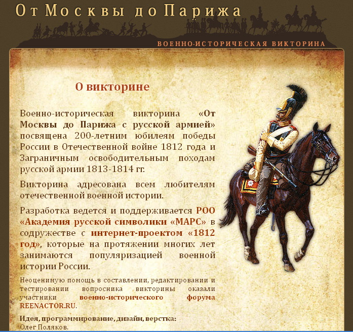 Военно-историческая викторина "От Москвы до Парижа с русской армией» состоит из ряда этапов: "От Москвы до Малоярославца», "От Малоярославца до Смоленска», "От Смоленска до Красного» и т.д. Для прохождения каждого этапа необходимо правильно ответить на все предлагаемые викториной вопросы.