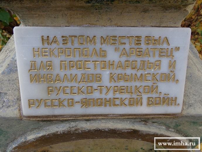 Указанное старинное надгробие в 2013 г. было спасено от уничтожения и обустроено активистами Общественного Совета, военно-исторической организации "Добровольческий корпус» и местными краеведами. По рекомендации одного из депутатов муниципального собрания района "Сокол» на надгробии установили информационную табличку с надписью "На этом месте был некрополь "Арбатец» для простонародья и инвалидов Крымской, Русско-турецкой, Русско-японской войн».