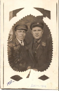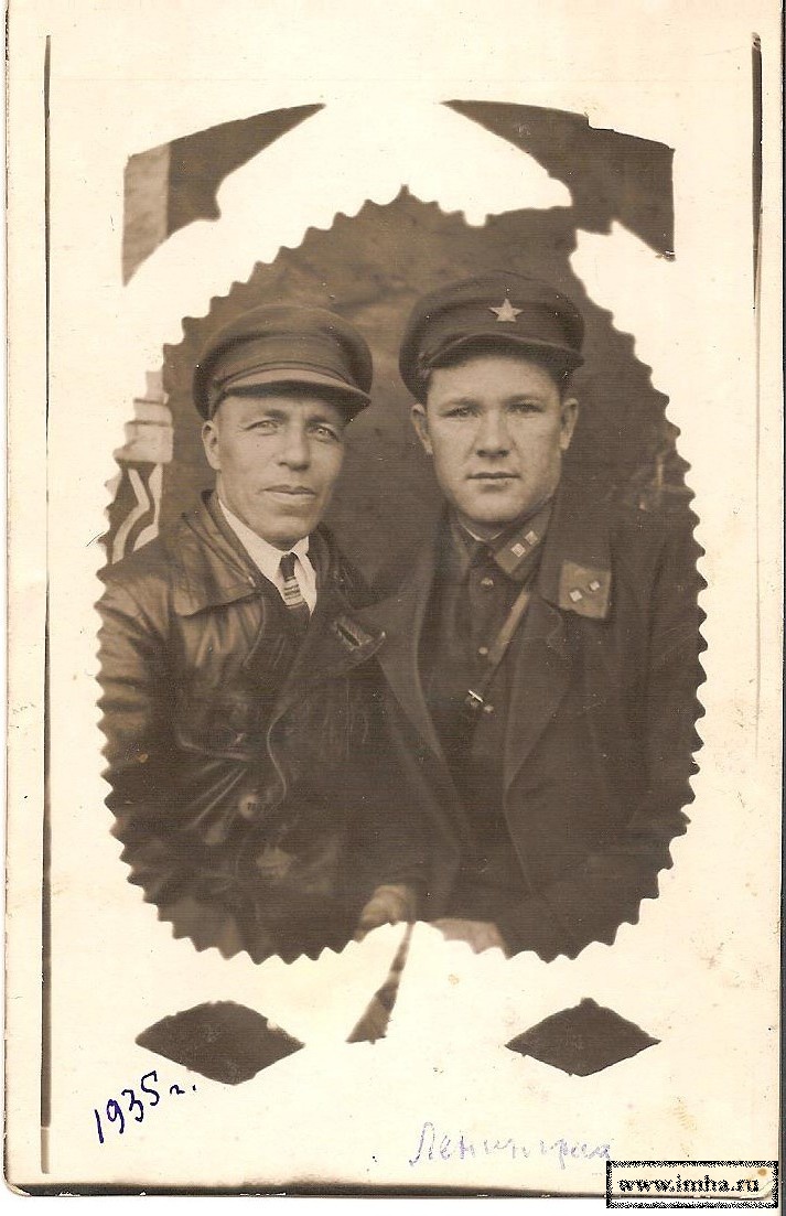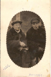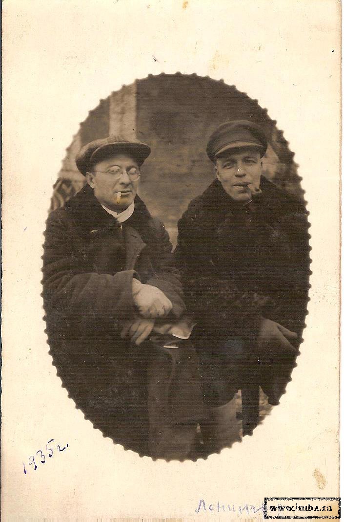 | Слева Степан Мартынович, справа начальник пикета на рынке. 1935 г. | Справа Степан Мартынович с приятелем писателем. |
