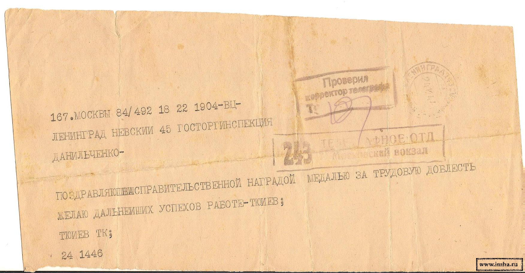 | Телеграмма с поздравлением о награждении правитетельственной наградой-медалью "ЗА ТРУДОВУЮ ДОБЛЕСТЬ" |