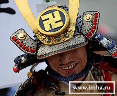 Все доспехи "боевого холопа» нередко обтягивались декоративной тканью определенного цвета или покрывались цветным лаком, что, вкупе с разноцветными шнурами, позволяло отличить своих самураев от "боевых холопов» неприятеля. Этой же цели служили и закрепленные за спиной "буси» опознавательные флажки ("касэ-дзири», а впоследствии - "сасимоно»), имевшие обычно (но далеко не всегда) форму вертикального по отношению к лревку прямоугольника, украшенные фамильными (или клановыми) гербами-"мон», эмблемами и иероглифическими девизами (типичным примером такого флага, дошедшего с самурайских времен до наших дней, является современный государственный флаг Японии с красным кругом Восходящего Солнца на белом поле, о чем еще пойдет речь далее). Порой на полотнище "сасимоно» изображалась личная эмблема его владельца (так, например, опознавательный флажок за спиной одного из военных предводителей самураев Северной Японии - Наримасы Сасы - был украшен черным изображением головы и верхней части туловища дьявола-"они» на белом поле). На белом полотнище "сасимоно» предводителя самураев Масасигэ Кусуноки (прикрепленного, между прочим, не к спинной части его доспеха, а к его правому наплечнику-"содэ»; такие опознавательные флажки именовались "содэ-дзири») был черной краской изображен не герб-"мон» самого доблестного "буси», всю свою жизнь сражавшегося только за самого Божественного Тэнно, не признавая над собой никаких других сюзеренов и господ и не обнажая меч ни за кого, кроме Микадо, а герб японского Императорского Дома – "хризантема над водой». Порой за спиной "буси» крепился не один, а два таких флажка, причем нередко на одном древке развевалось, вместо одного большого, несколько флажков сравнительно небольшого размера. В отдельных случаях (например, у конных гвардейцев первого объединителя Японии полководца-христианина Нобунаги Оды из отряда "Черных дьяволов») эта пара заплечных флажков приобретала форму настоящих "крыльев», подобных крыльям за плечами конников турецкой Османской (Оттоманской) Империи, литовских и польских гусар Речи (Жечи) Посполитой и конных телохранителей-"жильцов» Московских Государей).