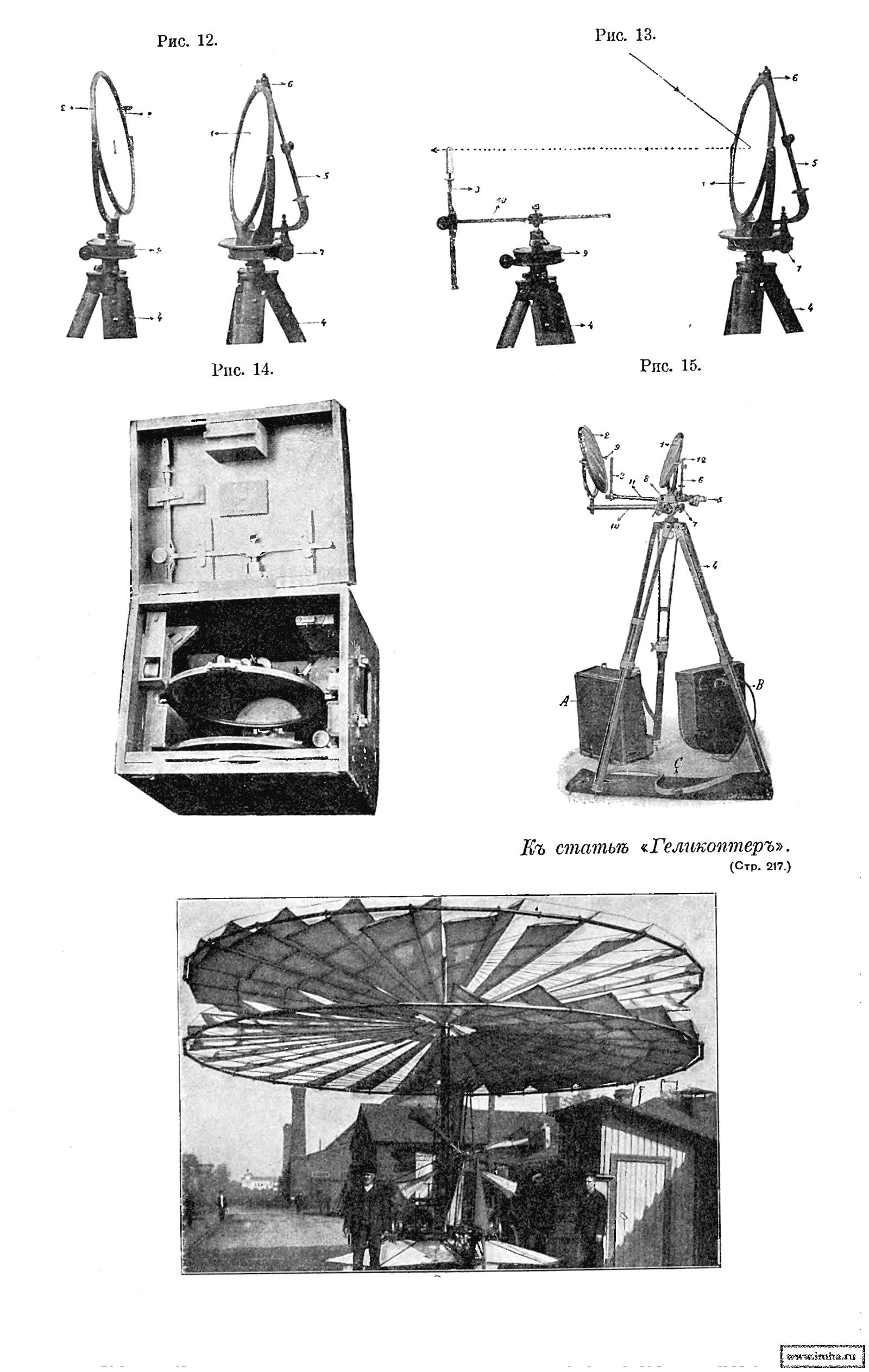На этих рисунках цифрами обозначены следующие части Гелиографа: 1 — рабочее зеркало, диам. 5 дм., 2 — вспомогательное зеркало, 3 — прицел, 4 — тренога, 5 — колпак, закрывающий головку треноги, 6 — ключ для гелиографирования, 7 и 8 — поворотное приспособления рабочего зеркала, 9 — поворотное приспособление вспомогательного зеркала, 10 — шестерня для поворота вспомогательного зеркала около вертикальной оси, 11 — гнездо для стойки прицела, 12 — шестерня для подъема его, 13 — откидной рычаг, вращающийся на шейке поворотной коробки 8, для установки прицела и вспомогательного зеркала.