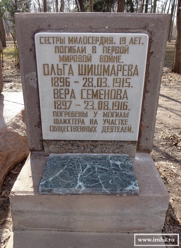 На мраморной плите высечена надпись: "Сестры милосердия. 19 лет. Погибли в Первой мировой войне. ОЛЬГА ШИШМАРЕВА 1896-28.03.1915. ВЕРА СЕМЕНОВА 1897-23.08.1916. Погребены у могилы Шлихтера на участке Общественных деятелей».