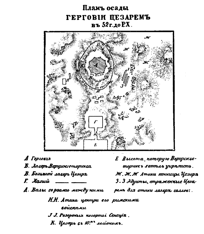 Посредине холма во всю его длину была построена галлами каменная стена высотой 6 фт., а от вершины его до города находилось несколько укрепленных лагерей.