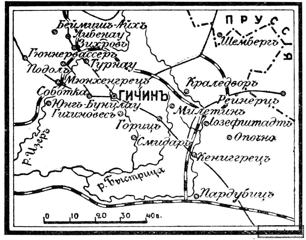 Пруссаки двинулись двумя колоннами, разделенными непроходимыми горами на 8 вер.: в правой шел II корпус, выступивший в полдень от Зихрова на Соботку к Гичину, имея в голове дивизию фон-Вердера; в левой — III корпус, выступивший от Ровенско к Гичину в 2 ч. дня, имея в авангарде дивизию фон-Тюмплинга.