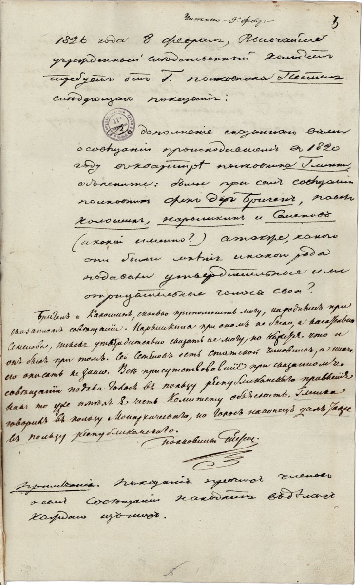 «1826 года 8 февраля высочайше учрежденный Следственный комитет требует от г[осподина] полковника Пестеля следующего показания: В дополнение сказанного вами о совещании, происходившем в 1820 г. в квартире полковника Глинки, объясните: были при сем совещании полковник фон дер Бриген, Павел Колошин, Нарышкин и Семенов (и какой именно?), а также, какого они были мнения и какого рода подавали утвердительные или отрицательные голоса свои? Бриген и Калошин, сколько припомнить могу, находились при сказанном совещании, Нарышкина при оном не было, а касательно Семенова, никак утвердительно сказать не могу, но, кажется, что и он был при том. Сей Семенов есть статский чиновник, а иначе его описать не знаю. Все присутствовавшие при сказанном совещании подали голос в пользу республиканского правления, как то уже имел я честь Комитету объяснить. Глинка говорил в пользу монархического, но голос, наконец, дал тоже в пользу республиканского.