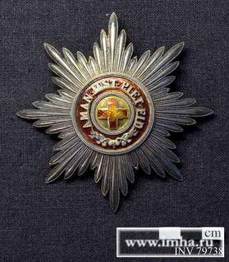 В центре ее, в медальоне, на золотистом поле, — красный крест, вокруг него, на красном эмалевом фоне, — девиз ордена.