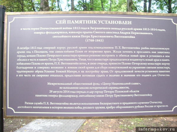 На церемонии отмечалось, что установка памятника Петру Витгенштейну – это совместный проект Псковор-Печерского монастыря, Центра национальной славы и администрации Псковской области. Автором монумента стал председатель Санкт-Петербургского Союза художников, Заслуженный художник России, скульптор А.С. Чаркин в Санкт-Петербурге.